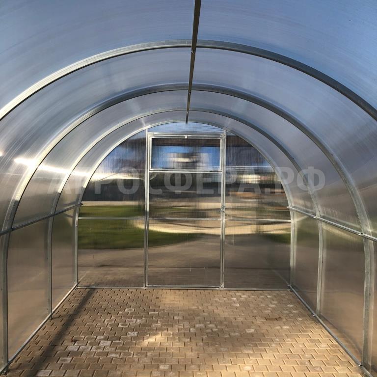 Теплица комплектуется качественным и долговечным сотовым поликарбонатом. Модель Агросфера-Фермер имеет двустворчатые двери в каждом торце; полностью совместима с дополнительными форточками, системами автопроветривания и автополива.
