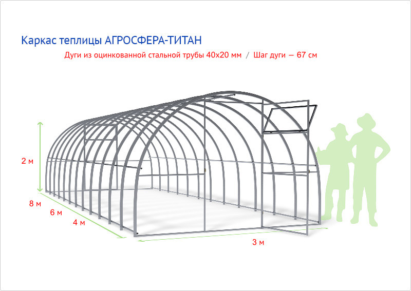 Длина теплицы: от 4 м до любой длины; шаг удлинения — по 2 мШаг дуги: 0,67 м