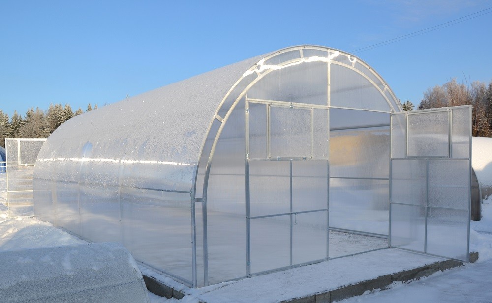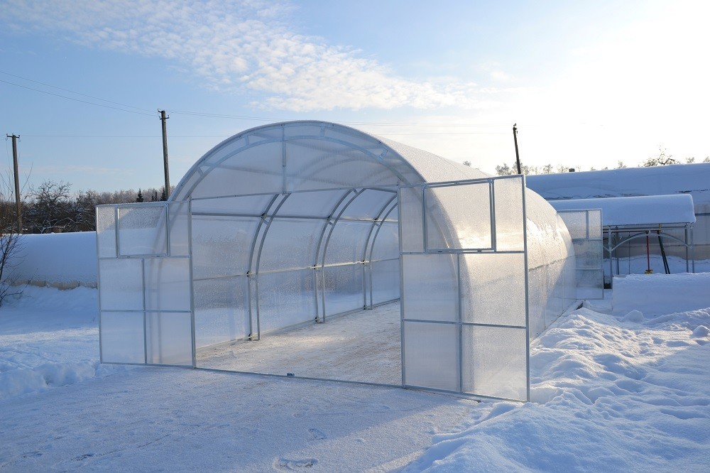 Это значит, что покрытая поликарбонатом теплица прекрасно проявляет себя даже при очень сильных снегопадах.