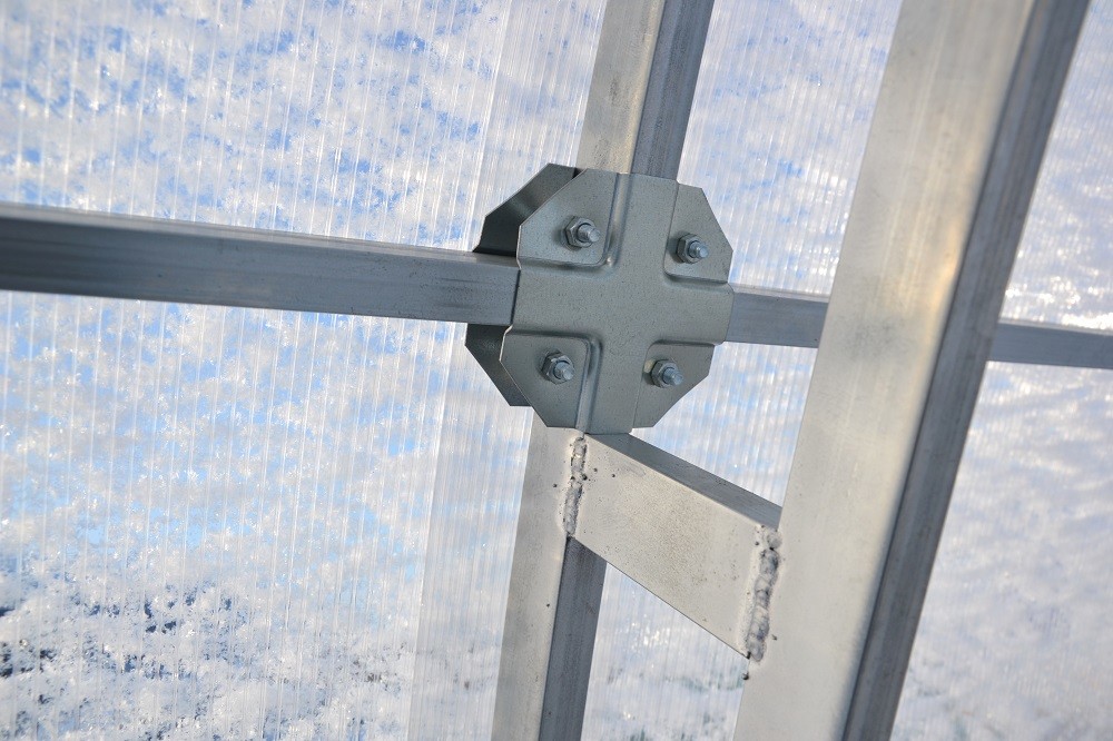 Дуги — главный несущий элемент теплицы. Для модели Агросфера-Престиж изготавливаются специальные дуги из широкой стальной трубы 30х20 мм, причём труба изогнута «на ребро». Дуги не только шире, чем в стандартных моделях, но и количество дуг в теплице увеличено (шаг дуги — 67 см), что обеспечивает более равномерное распределение снеговой нагрузки на сотовый поликарбонат. Вот почему сверхпрочный сварной каркас Агросфера-Престиж спокойно выдерживает снеговую нагрузку 150 кг на м2 (соответствует 40 см свежевыпавшего снега). Это значит, что покрытая поликарбонатом теплица прекрасно проявит себя даже в самых снежных регионах России