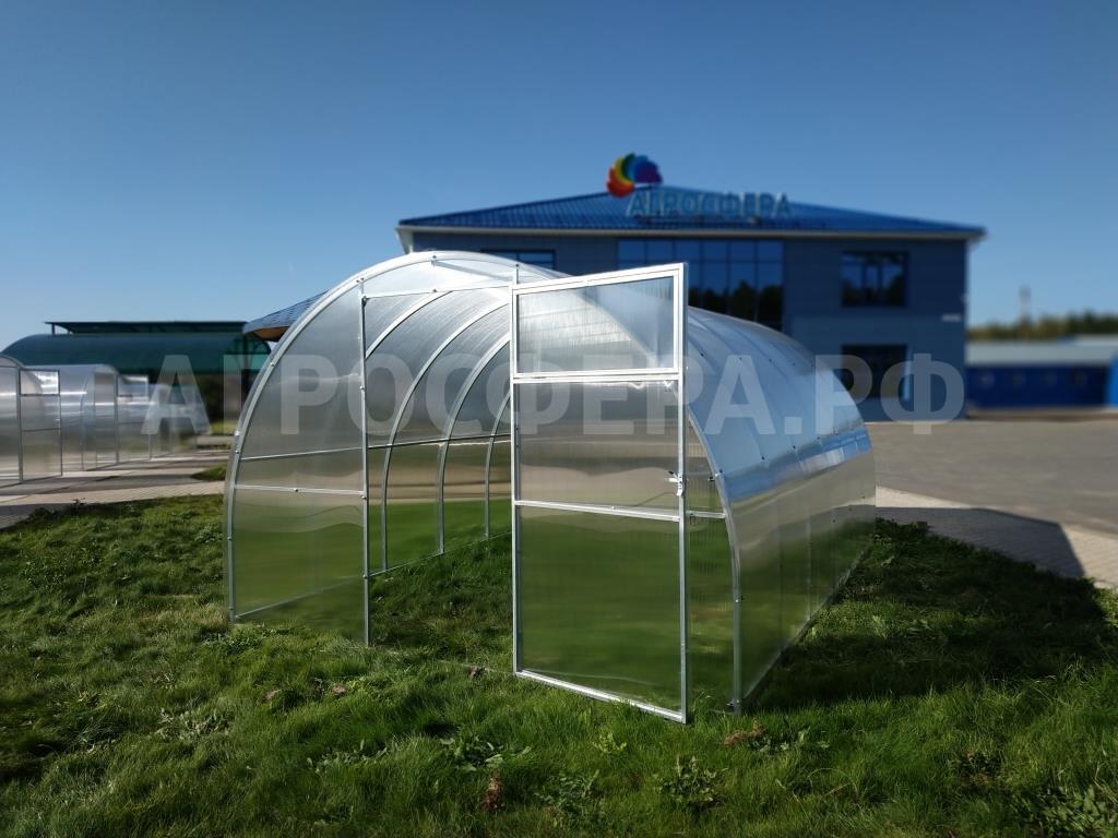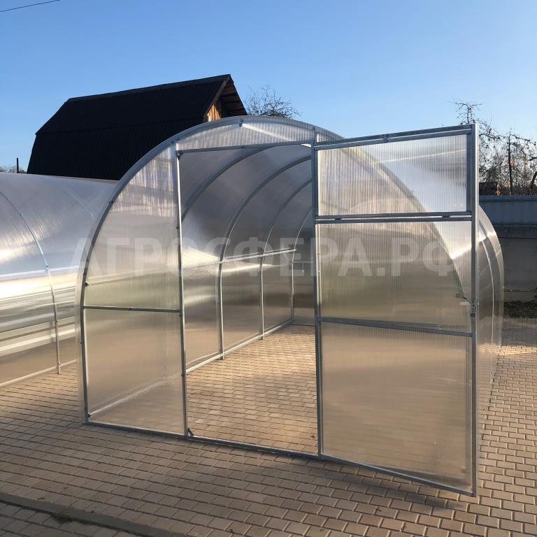 Теплица комплектуется качественным и долговечным сотовым поликарбонатом. Модель Агросфера-Фермер имеет двустворчатые двери в каждом торце; полностью совместима с дополнительными форточками, системами автопроветривания и автополива.