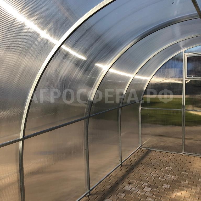 Усиленную теплицу Агросфера-Плюс выбирают те, кто ищет повышенную надёжность. Практичная и эстетичная Агросфера-Плюс имеет больше дуг, чем базовая модель Агросфера-Стандарт. Преимущества такой конструкции — особая прочность каркаса и более равномерное распределение снеговой нагрузки на сотовый поликарбонат.