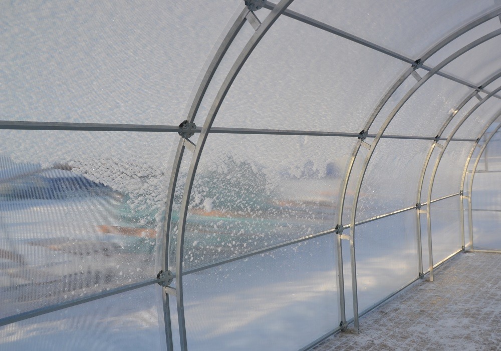 Это значит, что покрытая поликарбонатом теплица прекрасно проявляет себя даже при очень сильных снегопадах.