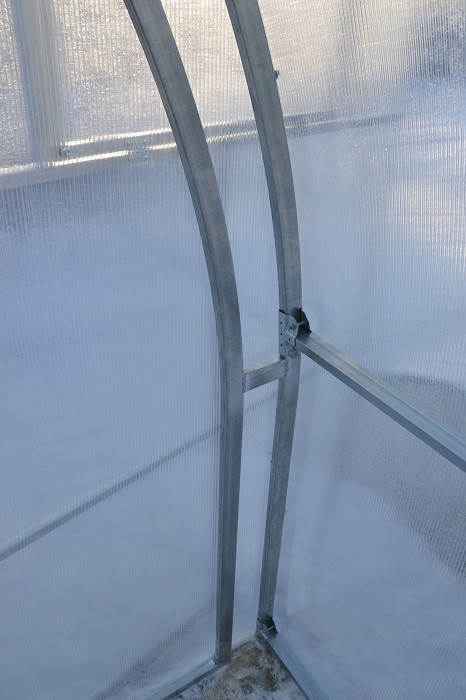Дуги — главный несущий элемент теплицы. Для модели Агросфера-Простор изготавливаются специальные двойные дуги из стальной трубы 40х20 мм, соединенных между собой прогонами из оцинкованной трубы 40х20 мм. Прогоны фиксируются с помощью крабовых соединений, что обеспечивает соединение в одной плоскости с дугами, давая дополнительную опору для сотового поликарбоната и придавая жесткость каркасу.