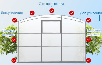 Усиленный сварной каркас Агросфера-Оптима выдерживает снеговую нагрузку 60 кг на м2 (соответствует 17 см снежного покрова).